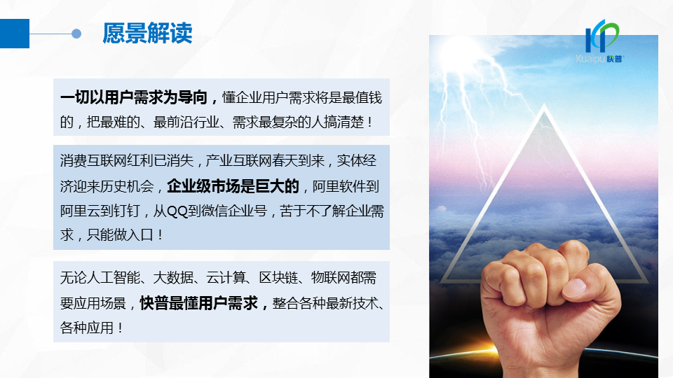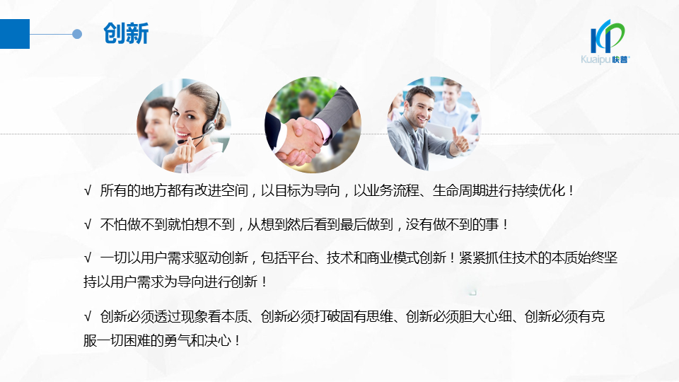 溫董在大會(huì)上指出:“成功的企業(yè)、成功的產(chǎn)品都在做符合人性的事!成功的個(gè)人都在挑戰(zhàn)人性弱點(diǎn)!作為中國(guó)企業(yè)信息化管理的服務(wù)商,我們應(yīng)該充分理解人性定律,為客戶提供一切人性化的產(chǎn)品與服務(wù),讓快普成為最懂企業(yè)用戶需求的中國(guó)企業(yè)!”