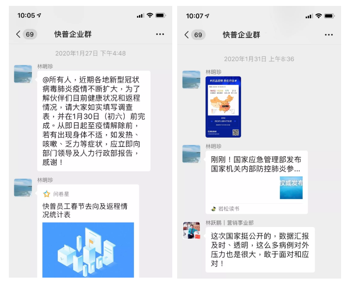 人力行政部快速啟動“快普公司疫情防控工作”,通過問卷登記、每日健康知識宣導(dǎo)、每日疫情發(fā)布,復(fù)工基本物資準備等一系列措施,全面關(guān)注員工動向及健康狀況,著力建設(shè)“平安快普”!